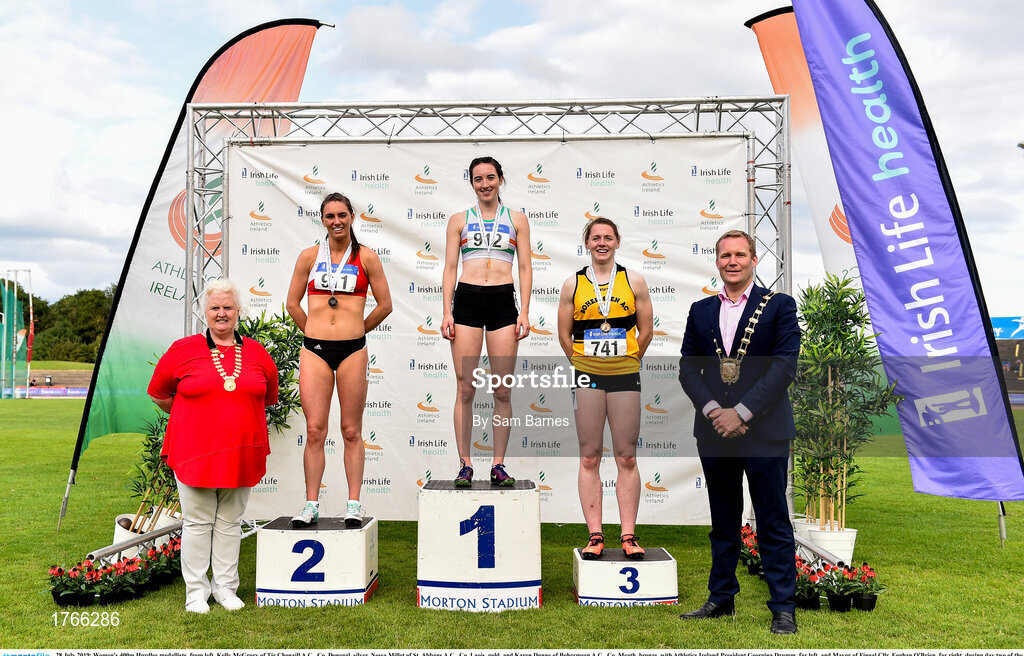 28 July 2019; Women's 400m Hurdles medallists, from left, Kelly McGrory of Tír Chonaill A.C., Co. Donegal, silver, Nessa Millet of St. Abbans A.C., Co. Laois, gold, and Karen Dunne of Bohermeen A.C., Co. Meath, bronze, with Athletics Ireland President Georgina Drumm, far left, and Mayor of Fingal Cllr. Eoghan O'Brien, far right, during day two of the Irish Life Health National Senior Track & Field Championships at Morton Stadium in Santry, Dublin. Photo by Sam Barnes/Sportsfile