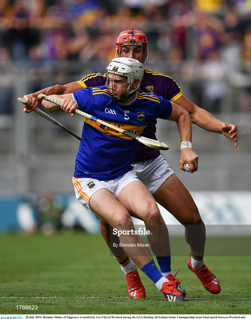 28 July 2019; Brendan Maher of Tipperary is tackled by Lee Chin of Wexford during the GAA Hurling All-Ireland Senior Championship Semi Final match between Wexford and Tipperary at Croke Park in Dublin. Photo by Brendan Moran/Sportsfile