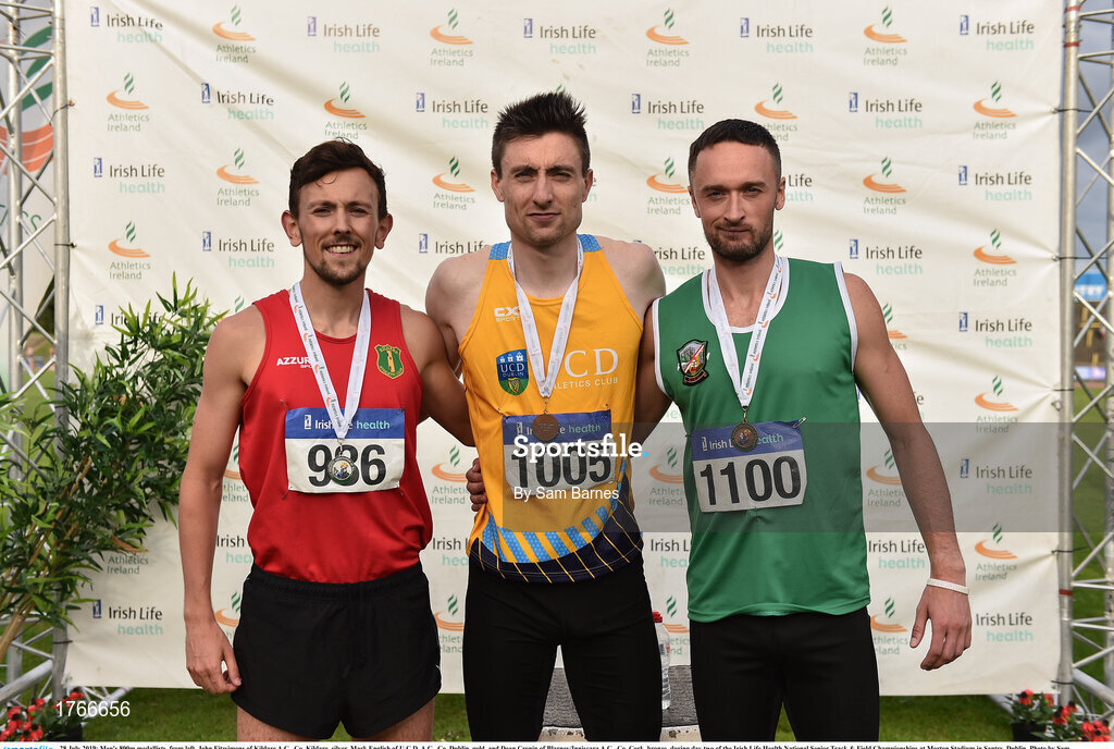 28 July 2019; Men's 800m medallists, from left, John Fitzsimons of Kildare A.C., Co. Kildare, silver, Mark English of U.C.D. A.C., Co. Dublin, gold, and Dean Cronin of Blarney/Inniscara A.C., Co. Cork, bronze, during day two of the Irish Life Health National Senior Track & Field Championships at Morton Stadium in Santry, Dublin. Photo by Sam Barnes/Sportsfile