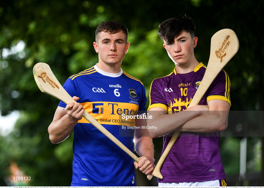 31 July 2019; At The Bord Gáis Energy GAA Hurling All-Ireland U-20 Championship semi-finals preview event in Dublin are Tipperary's Paddy Cadell and Wexford's Charlie Mc Guckin. They were joined by Joe Canning and Ger Cunningham, who were announced as judges for the Bord Gáis Energy U-20 Player of the Year Award, Kilkenny’s Adrian Mullen and Cork’s Brian Turnbull. Kerry’s Adam O’Sullivan and Down’s Ruairí McCrickard were also in Dublin to look forward the Richie McElligott Cup decider. Photo by Stephen McCarthy/Sportsfile