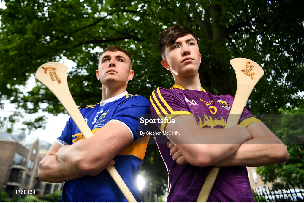 31 July 2019; At The Bord Gáis Energy GAA Hurling All-Ireland U-20 Championship semi-finals preview event in Dublin are Tipperary's Paddy Cadell and Wexford's Charlie Mc Guckin. They were joined by Joe Canning and Ger Cunningham, who were announced as judges for the Bord Gáis Energy U-20 Player of the Year Award, Kilkenny’s Adrian Mullen and Cork’s Brian Turnbull. Kerry’s Adam O’Sullivan and Down’s Ruairí McCrickard were also in Dublin to look forward the Richie McElligott Cup decider. Photo by Stephen McCarthy/Sportsfile