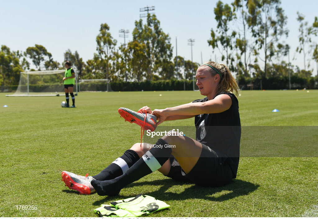 1 August 2019; Louise Quinn laces her boots during a Republic of Ireland women's team training session at Dignity Health Sports Park in Carson, California, USA. Photo by Cody Glenn/Sportsfile