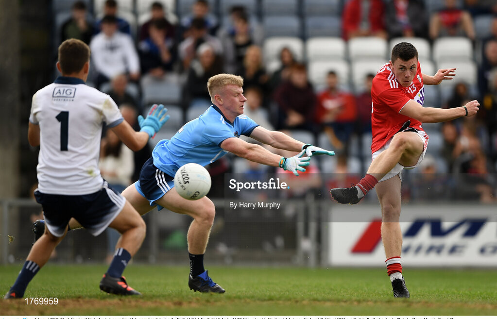3 August 2019; Mark Cronin of Cork shoots to score his side's second goal during the EirGrid GAA Football All-Ireland U20 Championship Final match between Cork and Dublin at O’Moore Park in Portlaoise, Laois. Photo by Harry Murphy/Sportsfile