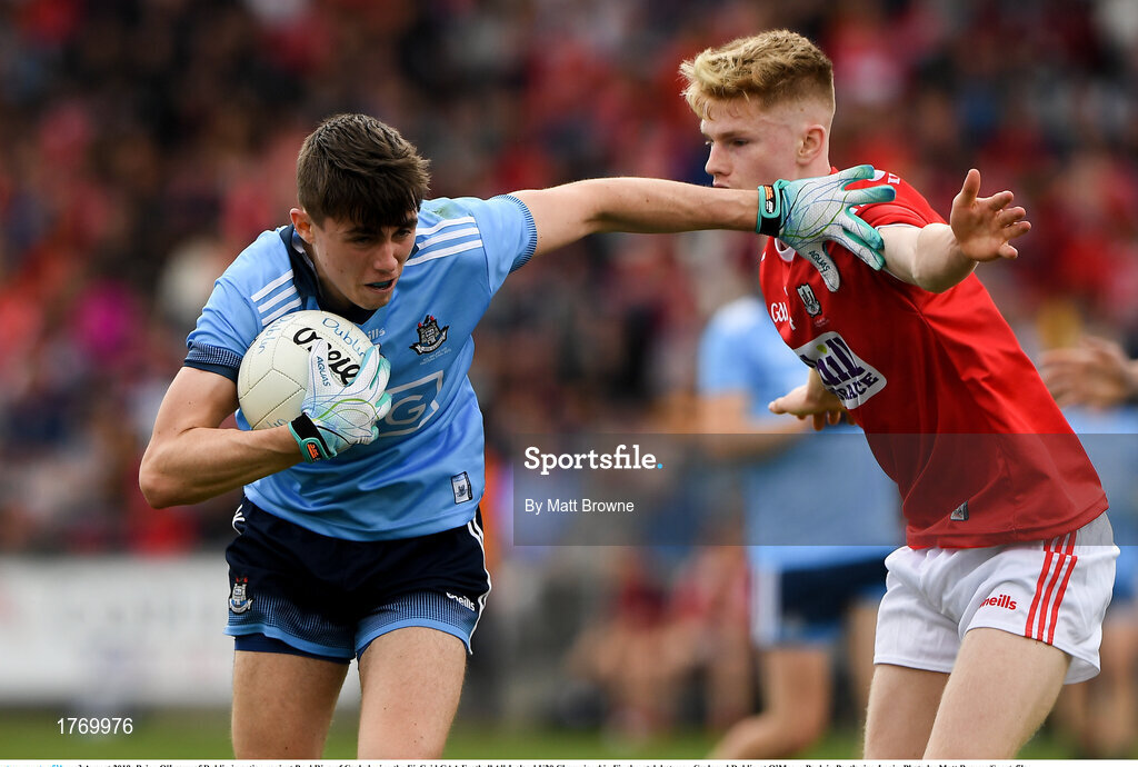 3 August 2019; Brian O'Leary of Dublin in action against Paul Ring of Cork during the EirGrid GAA Football All-Ireland U20 Championship Final match between Cork and Dublin at O’Moore Park in Portlaoise, Laois. Photo by Matt Browne/Sportsfile