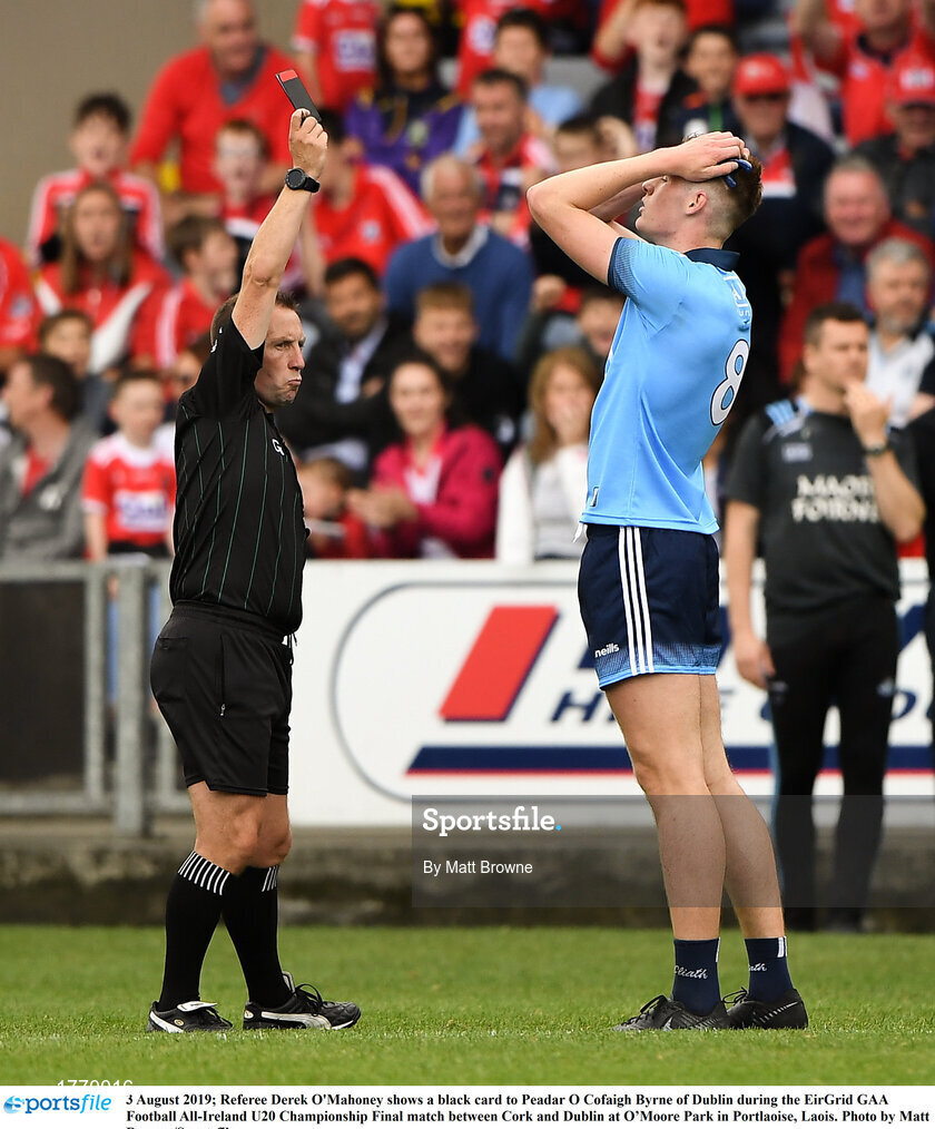3 August 2019; Referee Derek O'Mahoney shows a black card to Peadar O Cofaigh Byrne of Dublin during the EirGrid GAA Football All-Ireland U20 Championship Final match between Cork and Dublin at O’Moore Park in Portlaoise, Laois. Photo by Matt Browne/Sportsfile