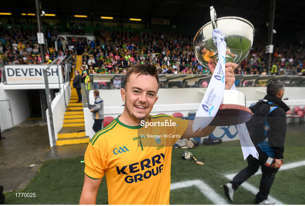 3 August 2019; Kerry captain Adam O'Sullivan celebrates with the Richie McElligott Cup following the Bord Gais Energy GAA Hurling All-Ireland U20B Championship Final match between Down and Kerry at Páirc Tailteann in Navan, Meath. Photo by Stephen McCarthy/Sportsfile