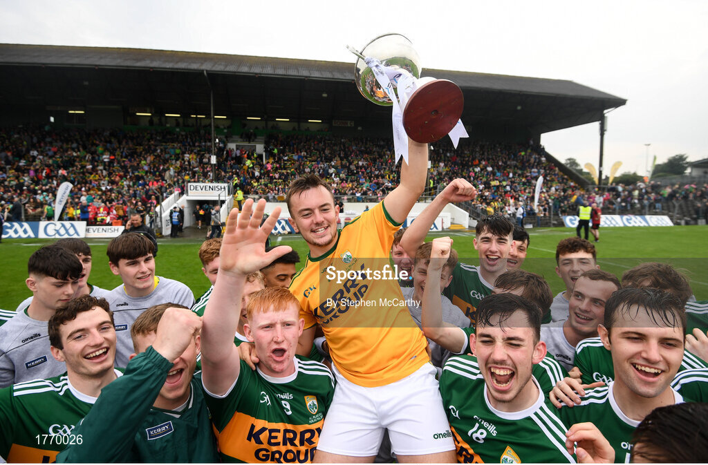 3 August 2019; Kerry captain Adam O'Sullivan and team-mates celebrate with the Richie McElligott Cup following the Bord Gais Energy GAA Hurling All-Ireland U20B Championship Final match between Down and Kerry at Páirc Tailteann in Navan, Meath. Photo by Stephen McCarthy/Sportsfile