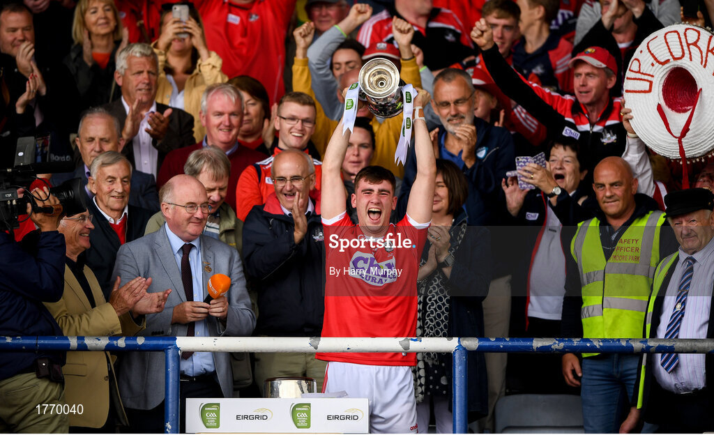 3 August 2019; Cork captain Peter O'Driscoll celebrates with the cup following the EirGrid GAA Football All-Ireland U20 Championship Final match between Cork and Dublin at O’Moore Park in Portlaoise, Laois. Photo by Harry Murphy/Sportsfile