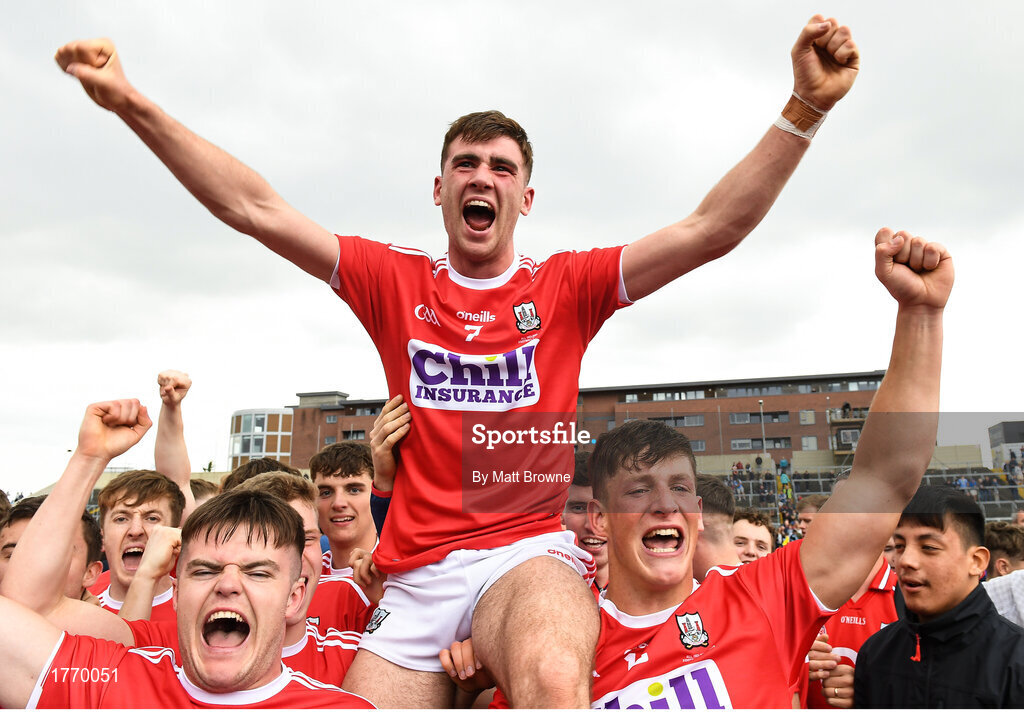 3 August 2019; Cork captain Peter O'Driscoll celebrates with his team-mates after the EirGrid GAA Football All-Ireland U20 Championship Final match between Cork and Dublin at O’Moore Park in Portlaoise, Laois. Photo by Matt Browne/Sportsfile