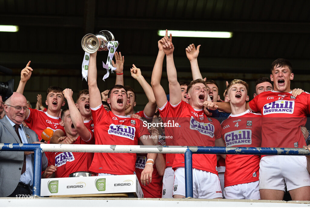 3 August 2019; Cork captain Peter O'Driscoll lifts the cup as his team-mates celebrate after the EirGrid GAA Football All-Ireland U20 Championship Final match between Cork and Dublin at O’Moore Park in Portlaoise, Laois. Photo by Matt Browne/Sportsfile