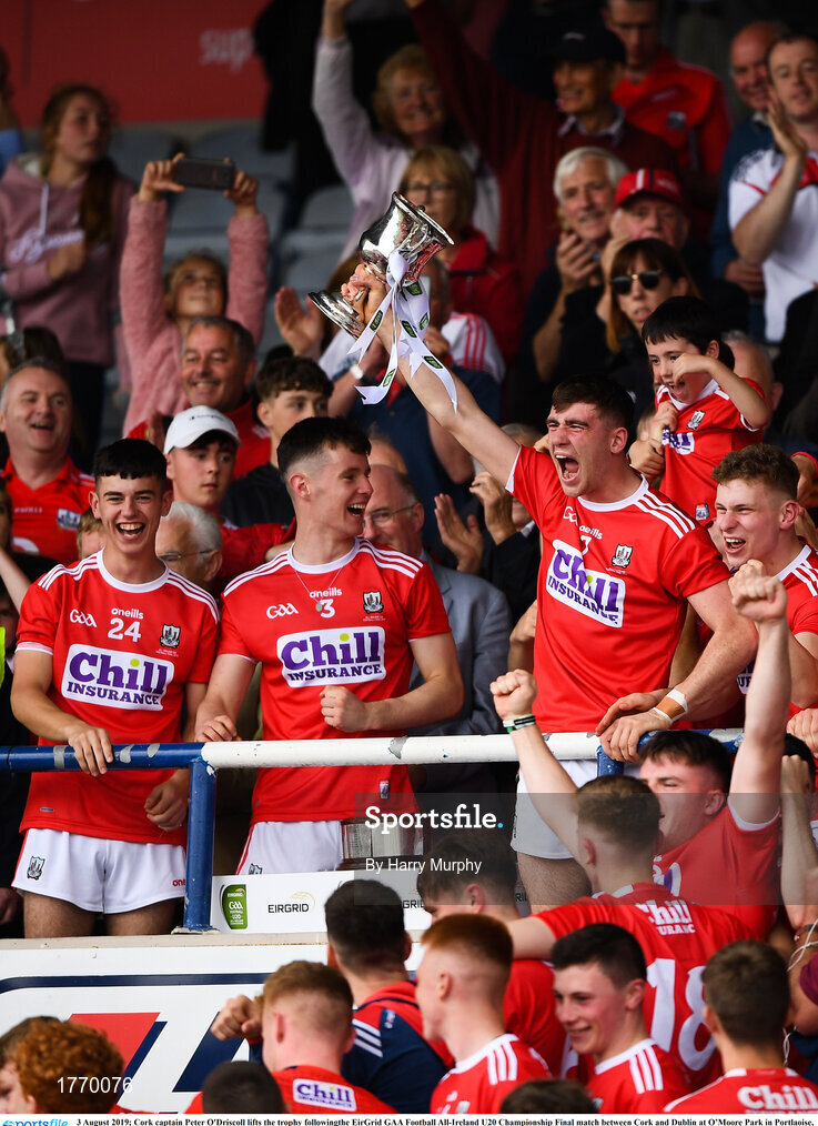 3 August 2019; Cork captain Peter O'Driscoll lifts the trophy followingthe EirGrid GAA Football All-Ireland U20 Championship Final match between Cork and Dublin at O’Moore Park in Portlaoise, Laois. Photo by Harry Murphy/Sportsfile
