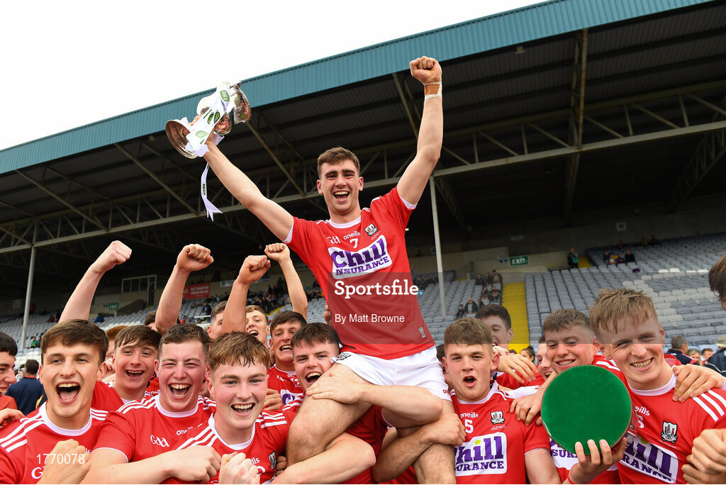 3 August 2019; Cork captain Peter O'Driscoll lifts the cup as his team-mates celebrate after the EirGrid GAA Football All-Ireland U20 Championship Final match between Cork and Dublin at O’Moore Park in Portlaoise, Laois. Photo by Matt Browne/Sportsfile