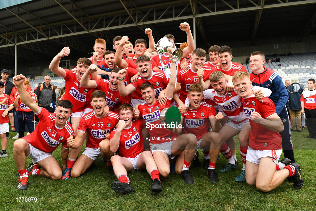 3 August 2019; Cork captain Peter O'Driscoll lifts the cup as his team-mates celebrate after the EirGrid GAA Football All-Ireland U20 Championship Final match between Cork and Dublin at O’Moore Park in Portlaoise, Laois. Photo by Matt Browne/Sportsfile