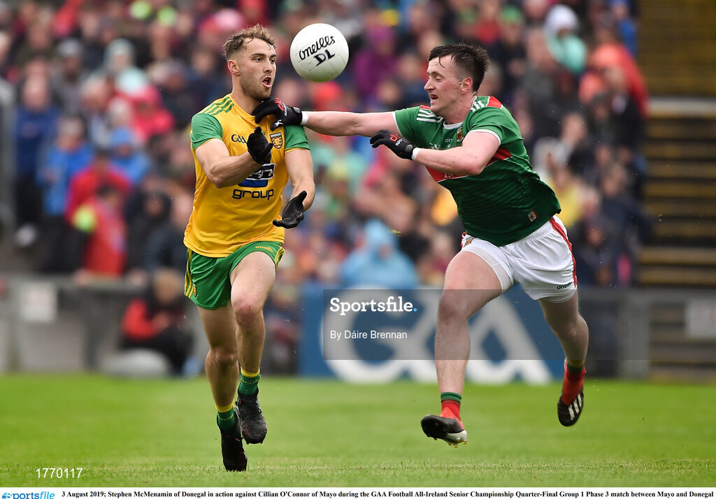 3 August 2019; Stephen McMenamin of Donegal in action against Cillian O'Connor of Mayo during the GAA Football All-Ireland Senior Championship Quarter-Final Group 1 Phase 3 match between Mayo and Donegal at Elvery’s MacHale Park in Castlebar, Mayo. Photo by Daire Brennan/Sportsfile