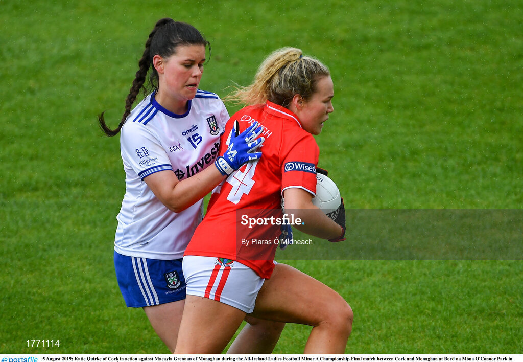 5 August 2019; Katie Quirke of Cork in action against Macayla Grennan of Monaghan during the All-Ireland Ladies Football Minor A Championship Final match between Cork and Monaghan at Bord na Móna O'Connor Park in Tullamore, Offaly. Photo by Piaras Ó Mídheach/Sportsfile
