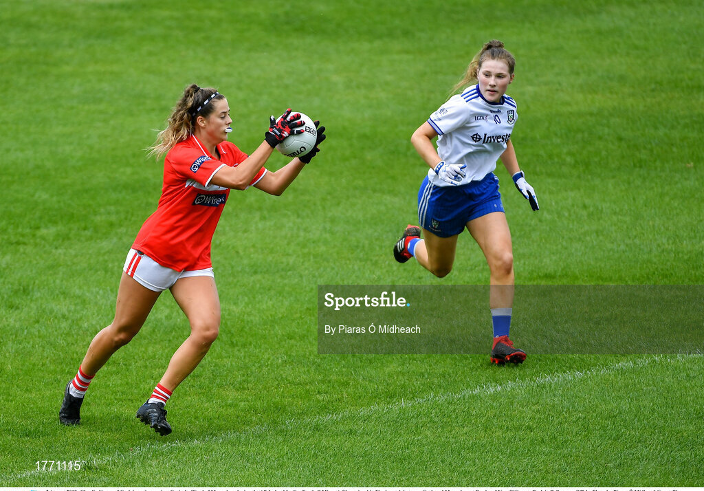 5 August 2019; Claudia Keane of Cork in action against Caoimhe Ward of Monaghan during the All-Ireland Ladies Football Minor A Championship Final match between Cork and Monaghan at Bord na Móna O'Connor Park in Tullamore, Offaly. Photo by Piaras Ó Mídheach/Sportsfile