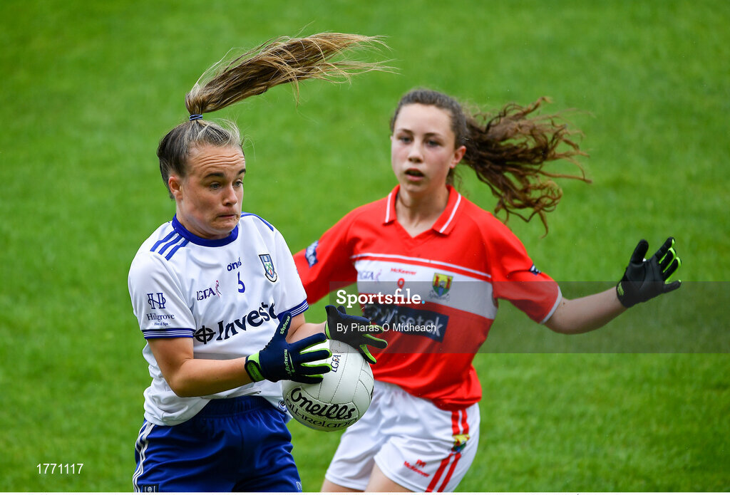 5 August 2019; Eimear Traynor of Monaghan in action against Abbie O'Mahony of Cork during the All-Ireland Ladies Football Minor A Championship Final match between Cork and Monaghan at Bord na Móna O'Connor Park in Tullamore, Offaly. Photo by Piaras Ó Mídheach/Sportsfile