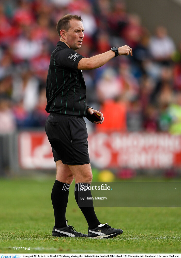 3 August 2019; Referee Derek O'Mahoney during the EirGrid GAA Football All-Ireland U20 Championship Final match between Cork and Dublin at O’Moore Park in Portlaoise, Laois. Photo by Harry Murphy/Sportsfile