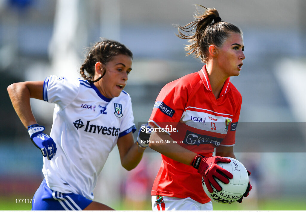 5 August 2019; Ellie Jack of Cork in action against Jane Duffy of Monaghan during the All-Ireland Ladies Football Minor A Championship Final match between Cork and Monaghan at Bord na Móna O'Connor Park in Tullamore, Offaly. Photo by Piaras Ó Mídheach/Sportsfile