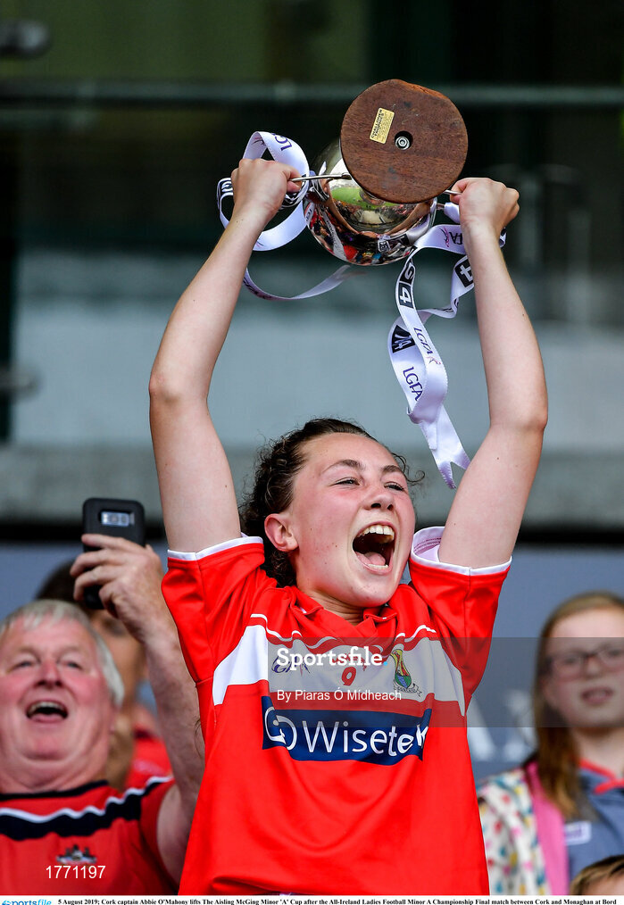 5 August 2019; Cork captain Abbie O'Mahony lifts The Aisling McGing Minor 'A' Cup after the All-Ireland Ladies Football Minor A Championship Final match between Cork and Monaghan at Bord na Móna O'Connor Park in Tullamore, Offaly. Photo by Piaras Ó Mídheach/Sportsfile