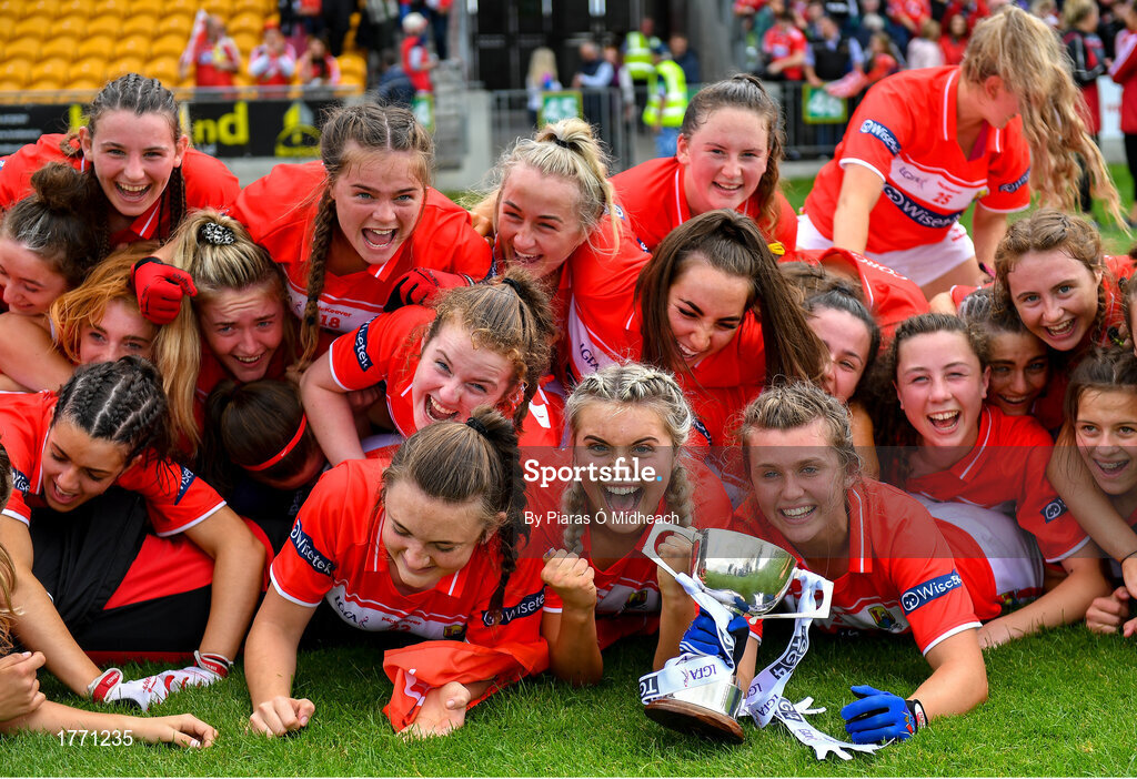5 August 2019; Cork players celebrate with The Aisling McGing Minor 'A' Cup after the All-Ireland Ladies Football Minor A Championship Final match between Cork and Monaghan at Bord na Móna O'Connor Park in Tullamore, Offaly. Photo by Piaras Ó Mídheach/Sportsfile