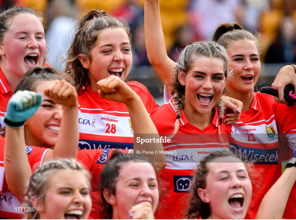 5 August 2019; Cork players celebrate after the All-Ireland Ladies Football Minor A Championship Final match between Cork and Monaghan at Bord na Móna O'Connor Park in Tullamore, Offaly. Photo by Piaras Ó Mídheach/Sportsfile