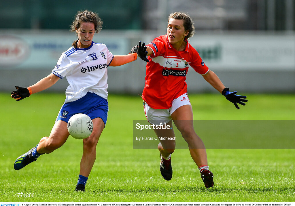 5 August 2019; Hannah Sherlock of Monaghan in action against Róisín Ní Chorcora of Cork during the All-Ireland Ladies Football Minor A Championship Final match between Cork and Monaghan at Bord na Móna O'Connor Park in Tullamore, Offaly. Photo by Piaras Ó Mídheach/Sportsfile