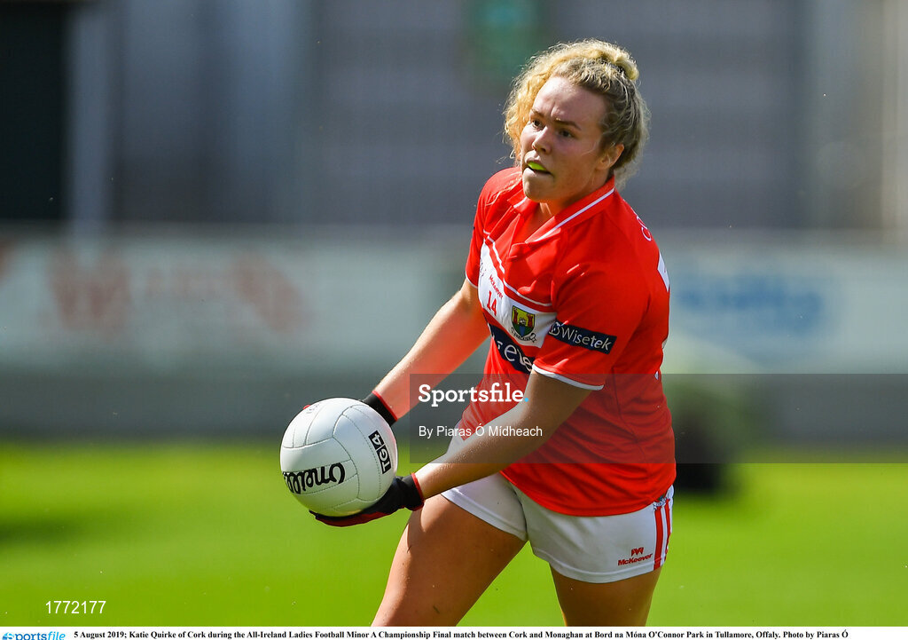 5 August 2019; Katie Quirke of Cork during the All-Ireland Ladies Football Minor A Championship Final match between Cork and Monaghan at Bord na Móna O'Connor Park in Tullamore, Offaly. Photo by Piaras Ó Mídheach/Sportsfile