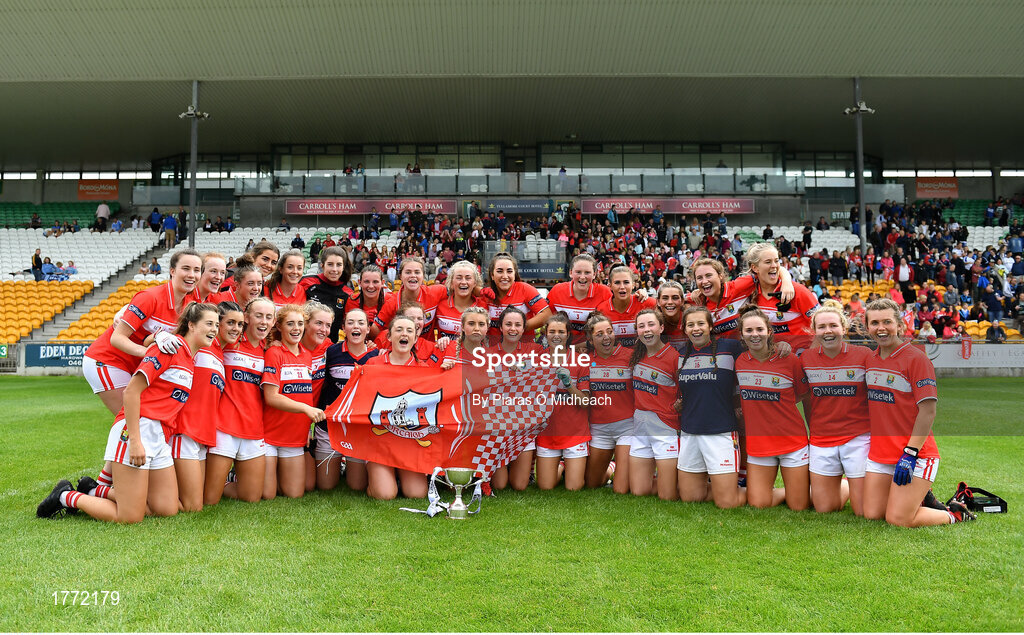 5 August 2019; Cork players celebrate after the All-Ireland Ladies Football Minor A Championship Final match between Cork and Monaghan at Bord na Móna O'Connor Park in Tullamore, Offaly. Photo by Piaras Ó Mídheach/Sportsfile