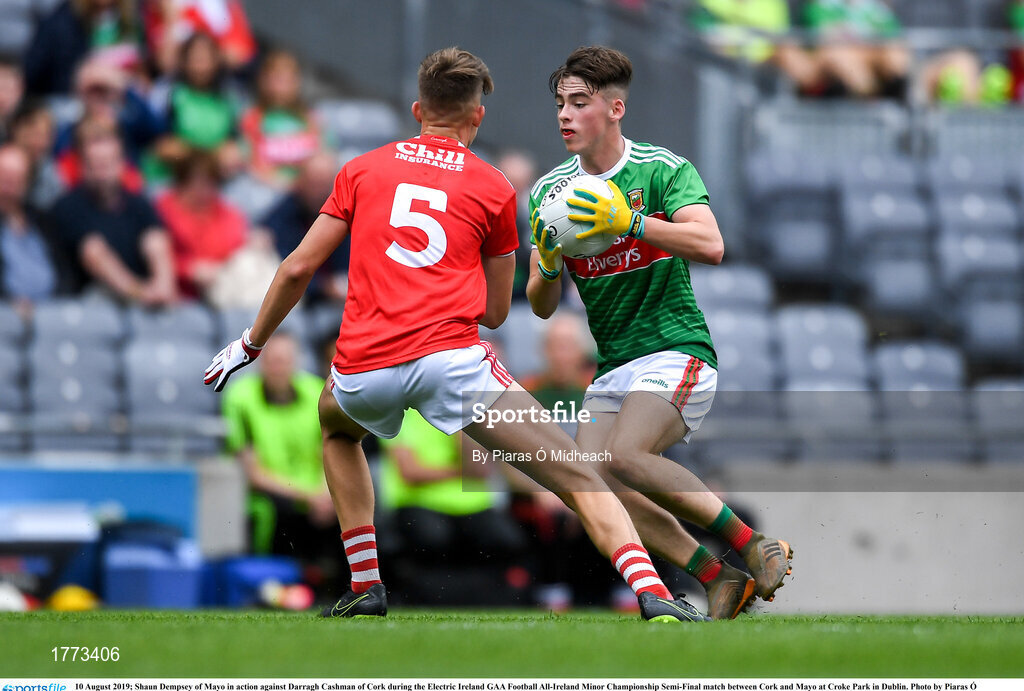 10 August 2019; Shaun Dempsey of Mayo in action against Darragh Cashman of Cork during the Electric Ireland GAA Football All-Ireland Minor Championship Semi-Final match between Cork and Mayo at Croke Park in Dublin. Photo by Piaras Ó Mídheach/Sportsfile