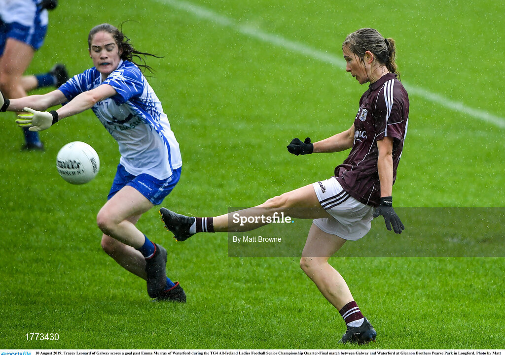 10 August 2019; Tracey Leonard of Galway scores a goal past Emma Murray of Waterford during the TG4 All-Ireland Ladies Football Senior Championship Quarter-Final match between Galway and Waterford at Glennon Brothers Pearse Park in Longford. Photo by Matt Browne/Sportsfile