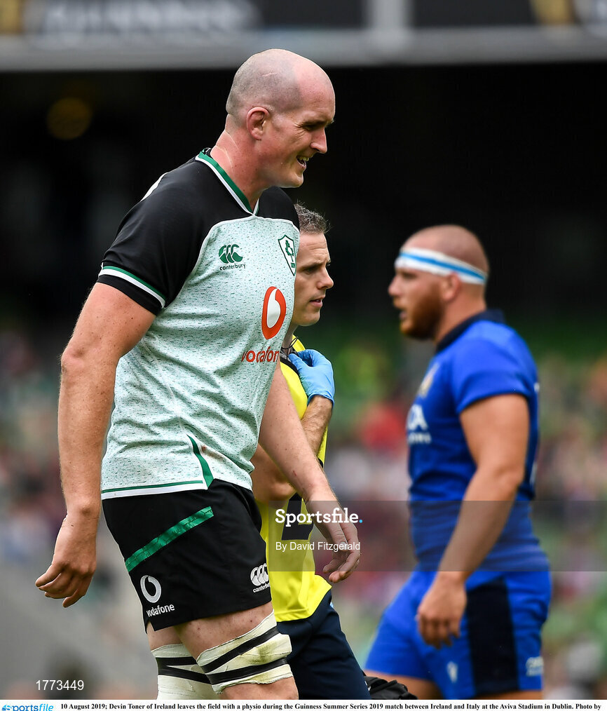 10 August 2019; Devin Toner of Ireland leaves the field with a physio during the Guinness Summer Series 2019 match between Ireland and Italy at the Aviva Stadium in Dublin. Photo by David Fitzgerald/Sportsfile
