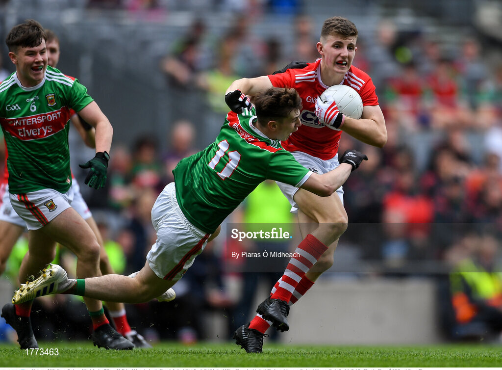 10 August 2019; Conor Corbett of Cork fends off Owen McHale of Mayo during the Electric Ireland GAA Football All-Ireland Minor Championship Semi-Final match between Cork and Mayo at Croke Park in Dublin. Photo by Piaras Ó Mídheach/Sportsfile