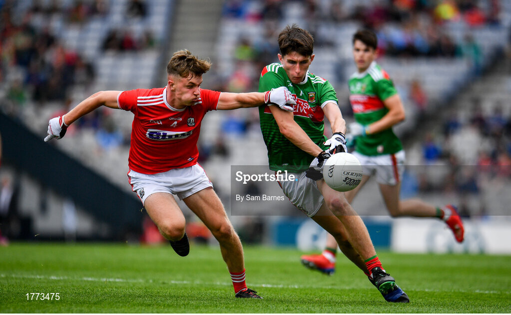 10 August 2019; Mark Tighe of Mayo in action against Daniel Peet of Cork during the Electric Ireland GAA Football All-Ireland Minor Championship Semi-Final match between Cork and Mayo at Croke Park in Dublin. Photo by Sam Barnes/Sportsfile