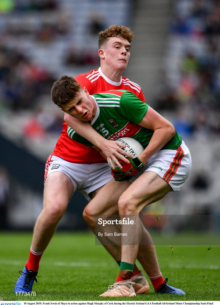 10 August 2019; Frank Irwin of Mayo in action against Hugh Murphy of Cork during the Electric Ireland GAA Football All-Ireland Minor Championship Semi-Final match between Cork and Mayo at Croke Park in Dublin. Photo by Sam Barnes/Sportsfile