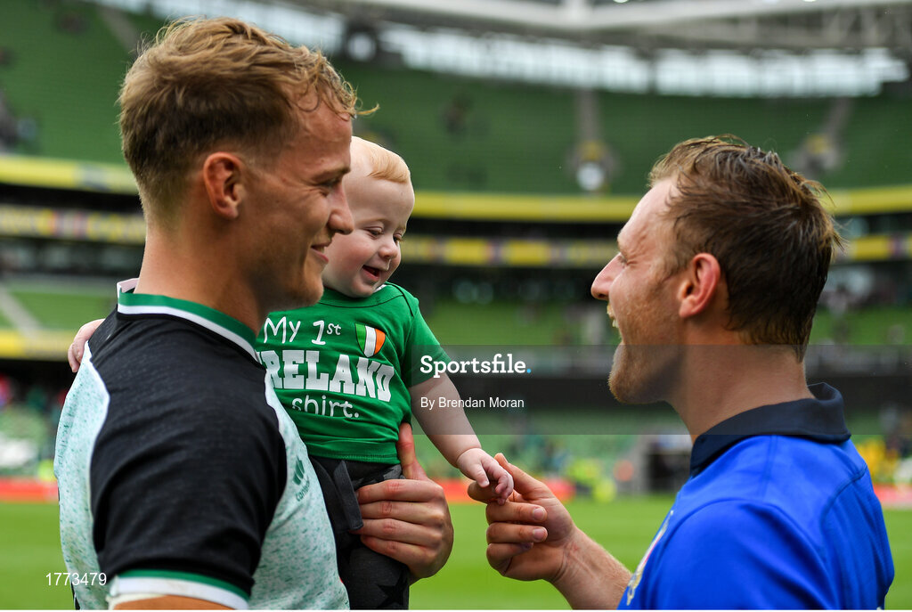 10 August 2019; Mike Haley of Ireland, with his son Frank, and Matteo Minozzi of Italy following the Guinness Summer Series 2019 match between Ireland and Italy at the Aviva Stadium in Dublin. Photo by Brendan Moran/Sportsfile