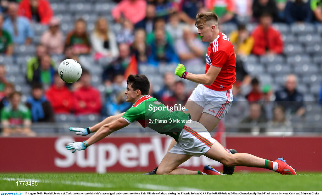 10 August 2019; Daniel Linehan of Cork shoots to score his side's second goal under pressure from Eoin Gilraine of Mayo during the Electric Ireland GAA Football All-Ireland Minor Championship Semi-Final match between Cork and Mayo at Croke Park in Dublin. Photo by Piaras Ó Mídheach/Sportsfile