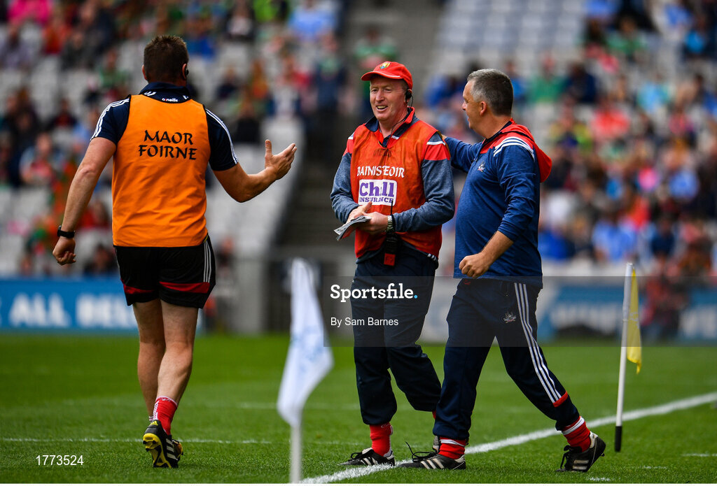 10 August 2019; Cork manager Bobby O'Dwyer, centre, is congratulated by his backroom team at the final whistle following the Electric Ireland GAA Football All-Ireland Minor Championship Semi-Final match between Cork and Mayo at Croke Park in Dublin. Photo by Sam Barnes/Sportsfile