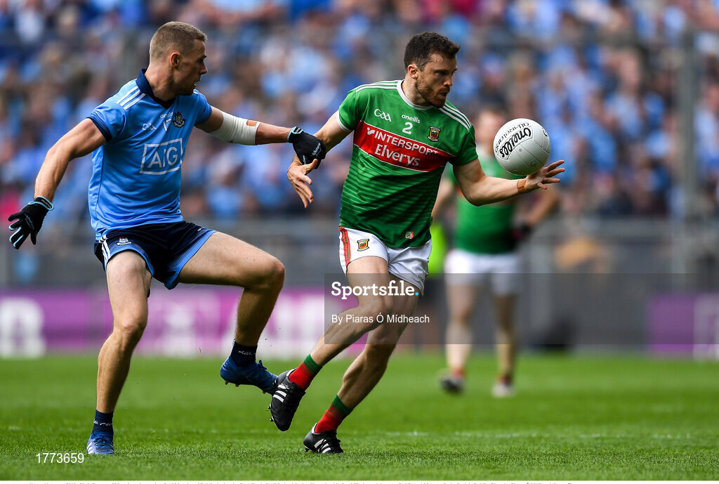 10 August 2019; Chris Barrett of Mayo in action against Paul Mannion of Dublin during the GAA Football All-Ireland Senior Championship Semi-Final match between Dublin and Mayo at Croke Park in Dublin. Photo by Piaras Ó Mídheach/Sportsfile