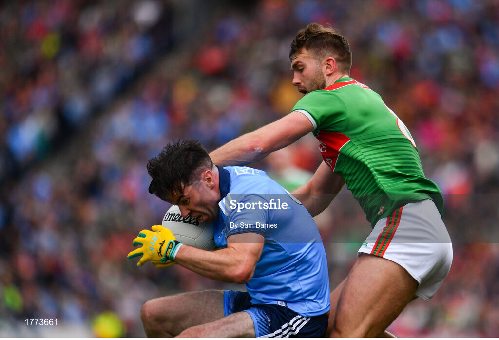 10 August 2019; Michael Darragh MacAuley of Dublin in action against Aidan O'Shea of Mayo during the GAA Football All-Ireland Senior Championship Semi-Final match between Dublin and Mayo at Croke Park in Dublin. Photo by Sam Barnes/Sportsfile