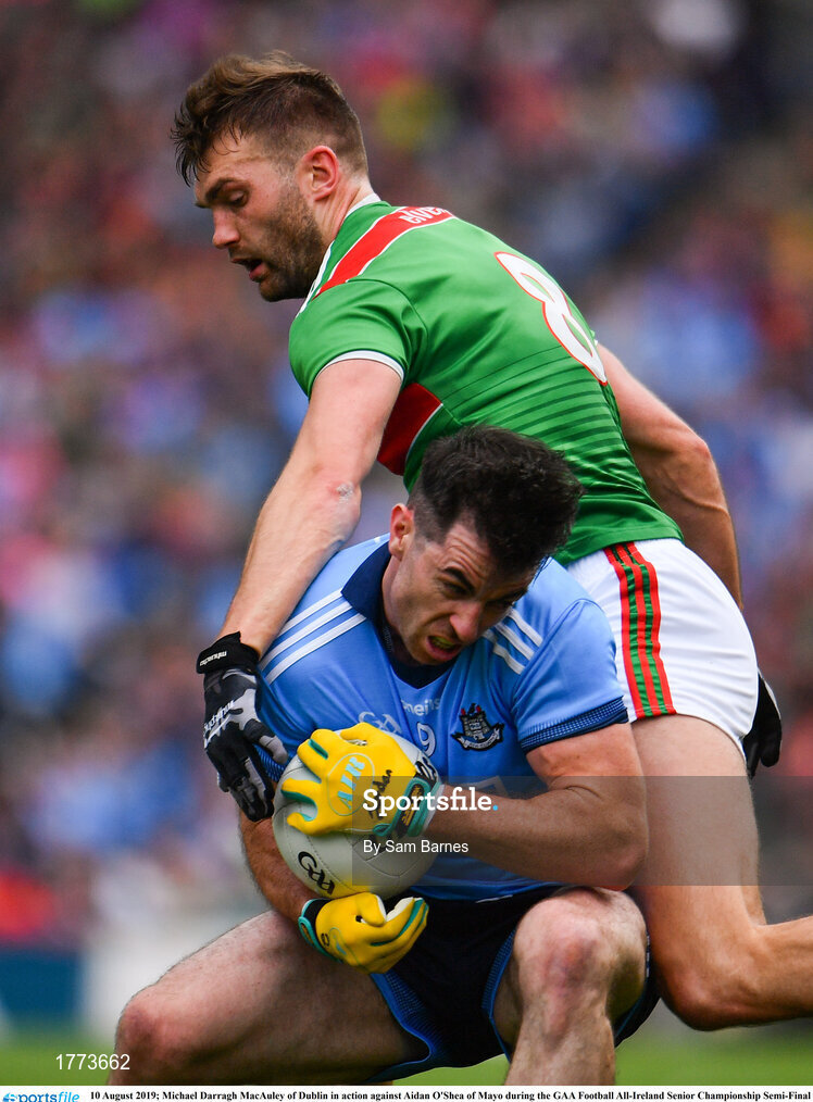 10 August 2019; Michael Darragh MacAuley of Dublin in action against Aidan O'Shea of Mayo during the GAA Football All-Ireland Senior Championship Semi-Final match between Dublin and Mayo at Croke Park in Dublin. Photo by Sam Barnes/Sportsfile