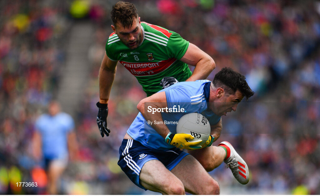 10 August 2019; Michael Darragh MacAuley of Dublin in action against Aidan O'Shea of Mayo during the GAA Football All-Ireland Senior Championship Semi-Final match between Dublin and Mayo at Croke Park in Dublin. Photo by Sam Barnes/Sportsfile