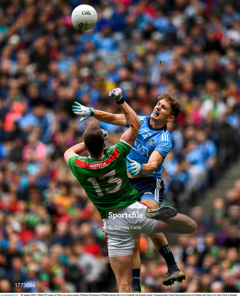 10 August 2019; Cillian O'Connor of Mayo in action against Michael Fitzsimons of Dublin during the GAA Football All-Ireland Senior Championship Semi-Final match between Dublin and Mayo at Croke Park in Dublin. Photo by Ramsey Cardy/Sportsfile