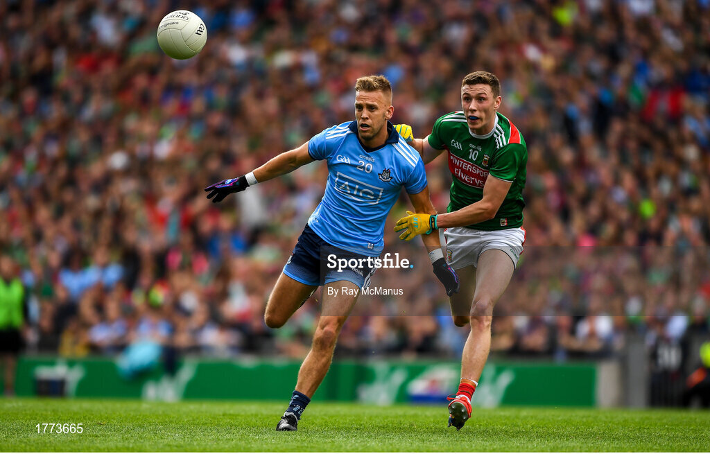 10 August 2019; Jonny Cooper of Dublin in action against Fionn McDonagh of Mayo during the GAA Football All-Ireland Senior Championship Semi-Final match between Dublin and Mayo at Croke Park in Dublin. Photo by Ray McManus/Sportsfile