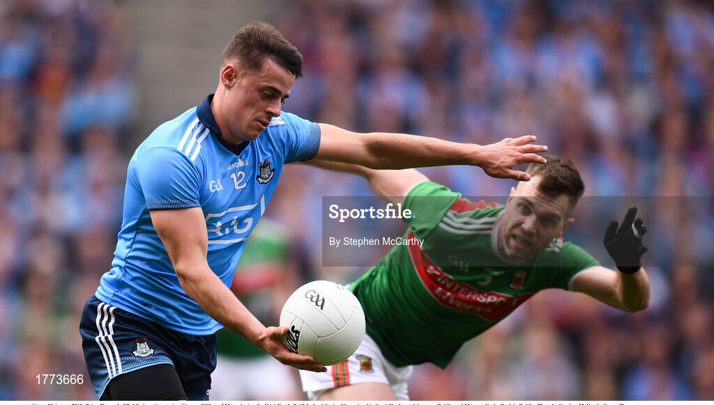 10 August 2019; Brian Howard of Dublin in action against Séamus O'Shea of Mayo during the GAA Football All-Ireland Senior Championship Semi-Final match between Dublin and Mayo at Croke Park in Dublin. Photo by Stephen McCarthy/Sportsfile