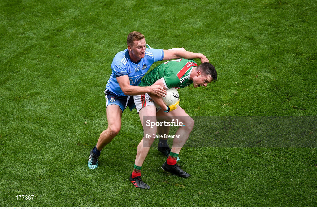 10 August 2019; Stephen Coen of Mayo in action against Ciarán Kilkenny of Dublin during the GAA Football All-Ireland Senior Championship Semi-Final match between Dublin and Mayo at Croke Park in Dublin. Photo by Daire Brennan/Sportsfile