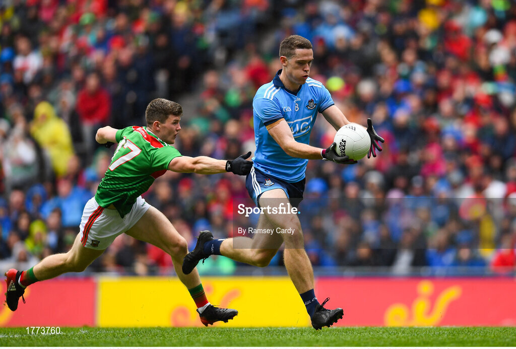 10 August 2019; Brian Fenton of Dublin is tackled by Eoin O'Donoghue of Mayo on his way to scoring his side's third goal during the GAA Football All-Ireland Senior Championship Semi-Final match between Dublin and Mayo at Croke Park in Dublin. Photo by Ramsey Cardy/Sportsfile