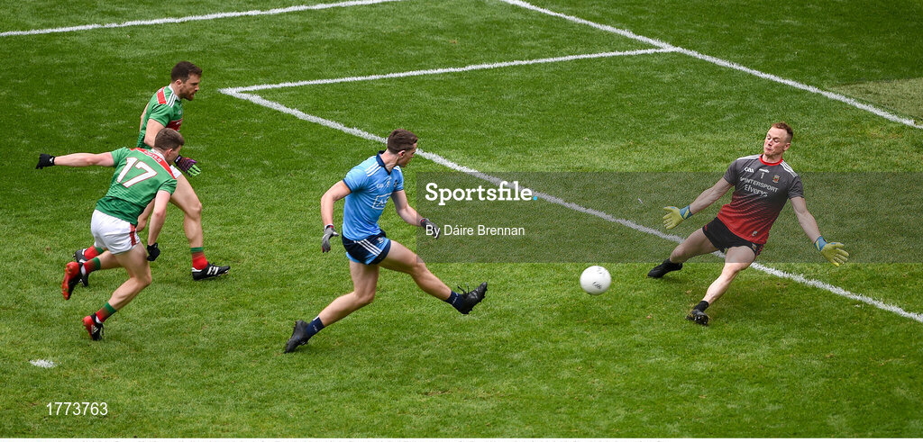 10 August 2019; Brian Fenton of Dublin scores his side's third goal during the GAA Football All-Ireland Senior Championship Semi-Final match between Dublin and Mayo at Croke Park in Dublin. Photo by Daire Brennan/Sportsfile