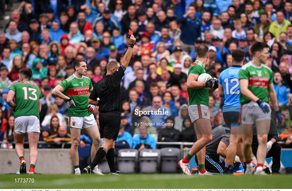 10 August 2019; Cillian O'Connor of Mayo receives a red card from referee Conor Lane during the GAA Football All-Ireland Senior Championship Semi-Final match between Dublin and Mayo at Croke Park in Dublin. Photo by Stephen McCarthy/Sportsfile