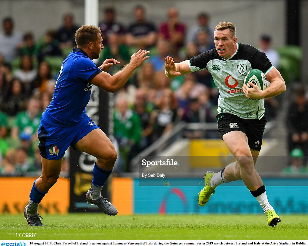 10 August 2019; Chris Farrell of Ireland in action against Tommaso Venvenuti of Italy during the Guinness Summer Series 2019 match between Ireland and Italy at the Aviva Stadium in Dublin. Photo by Seb Daly/Sportsfile